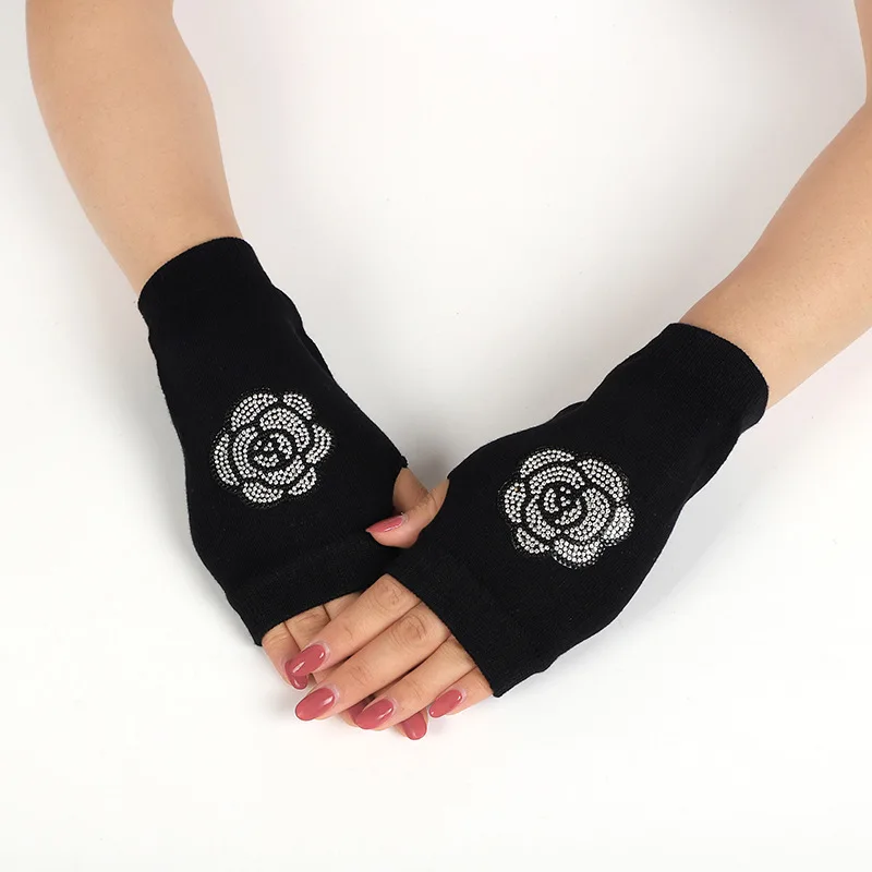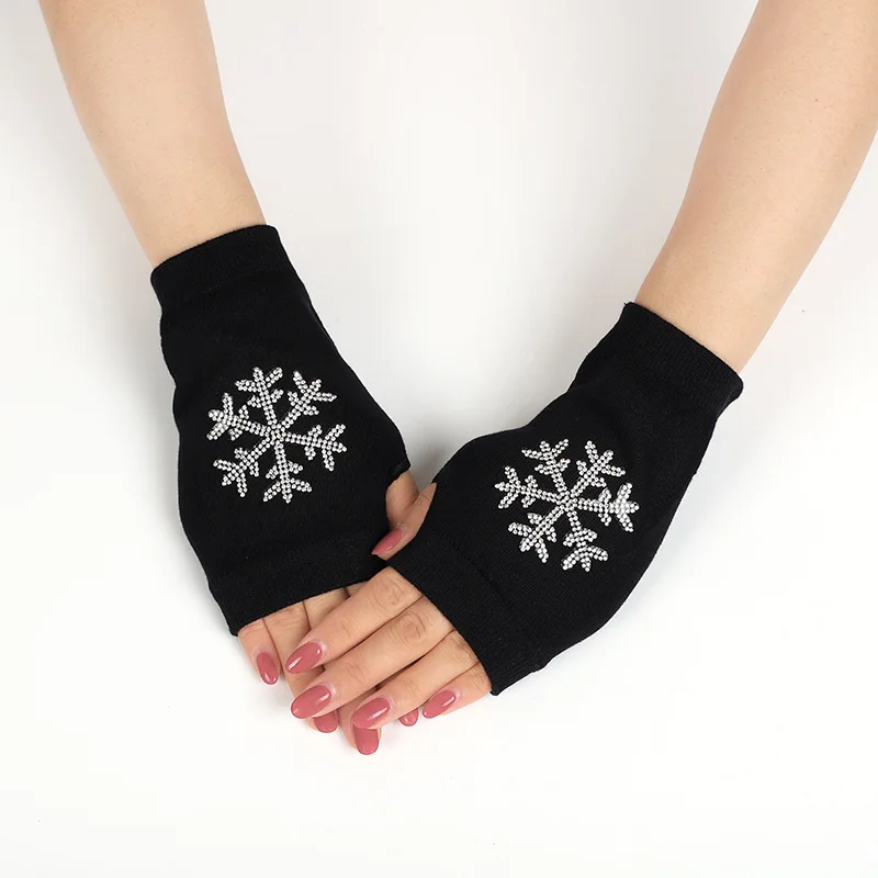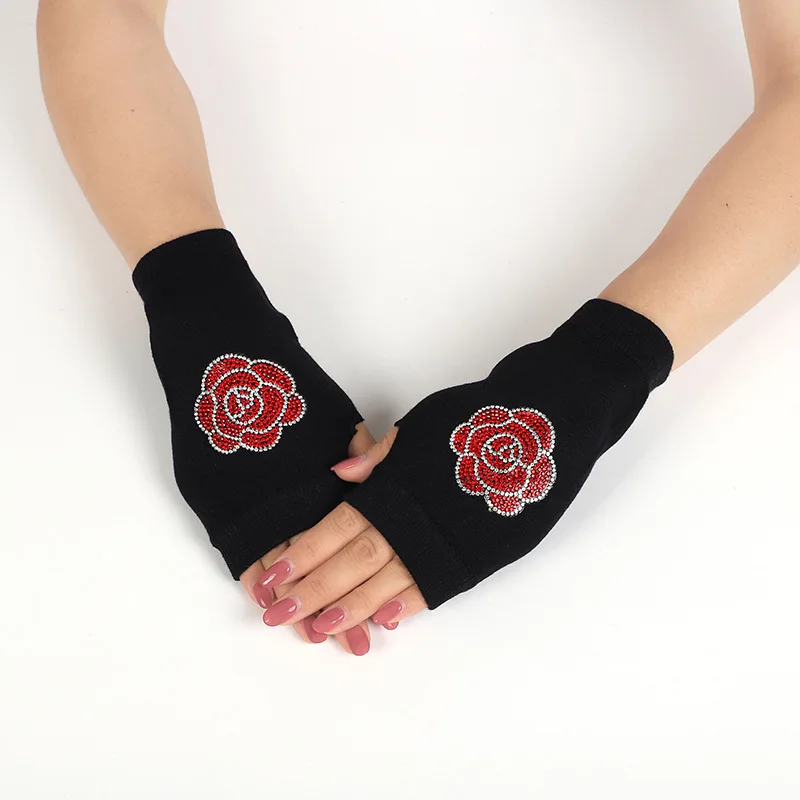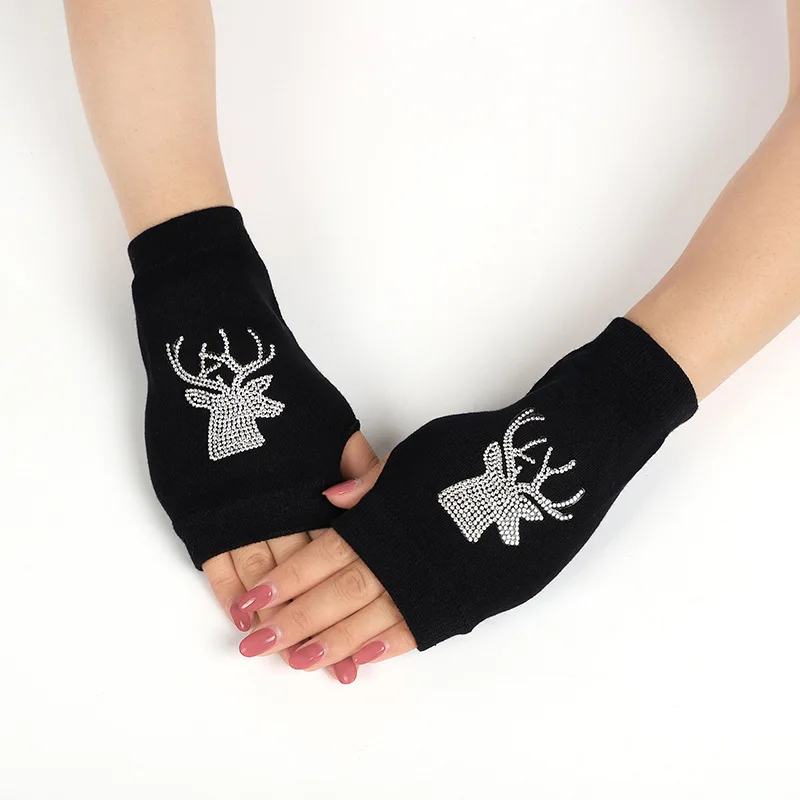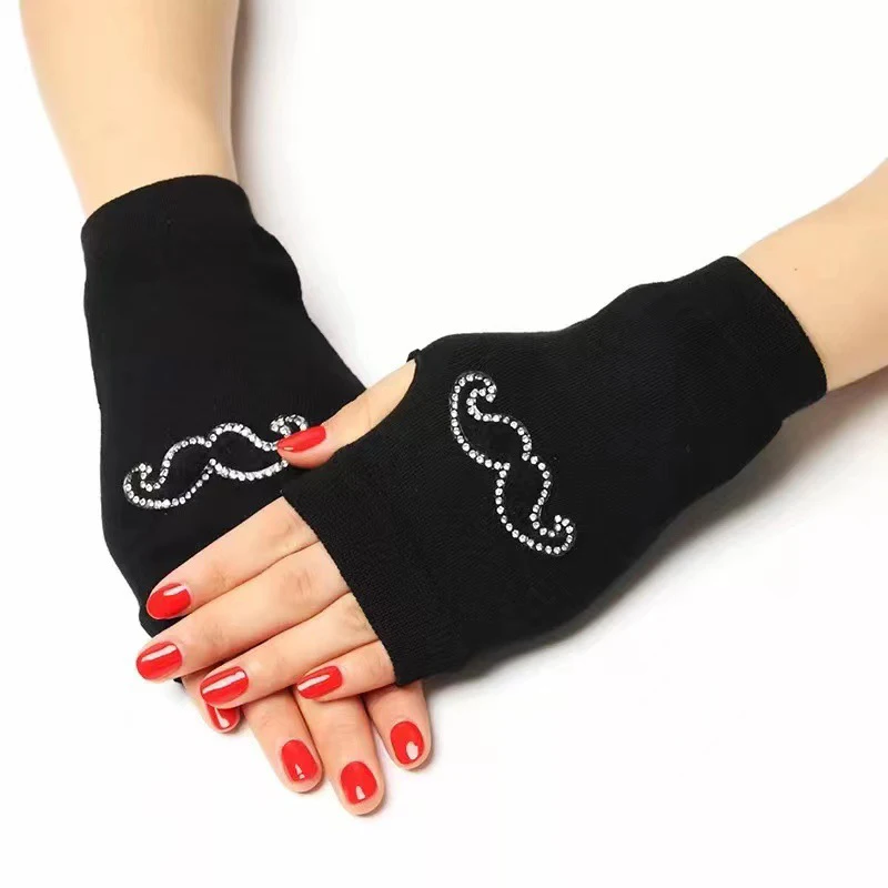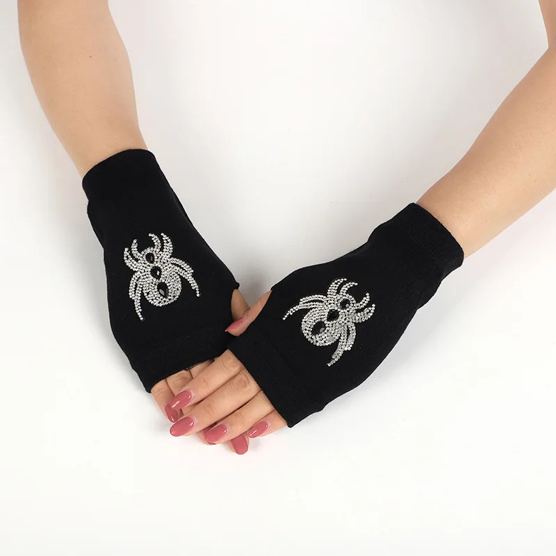 1 Pair Rhinestone Fingerless Gloves CUte Cartoon Animals Pattern Women Men Black Knitted Half Finger Gothic Warm Winter Mittens