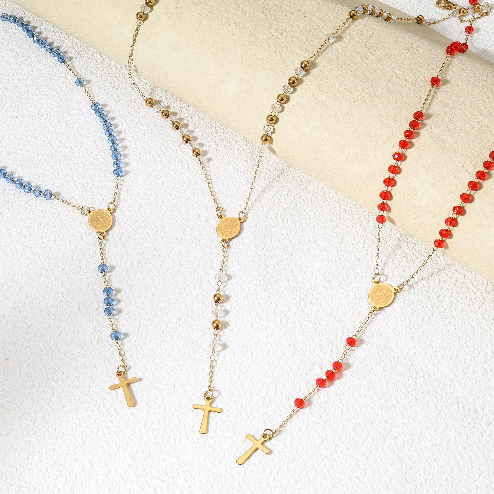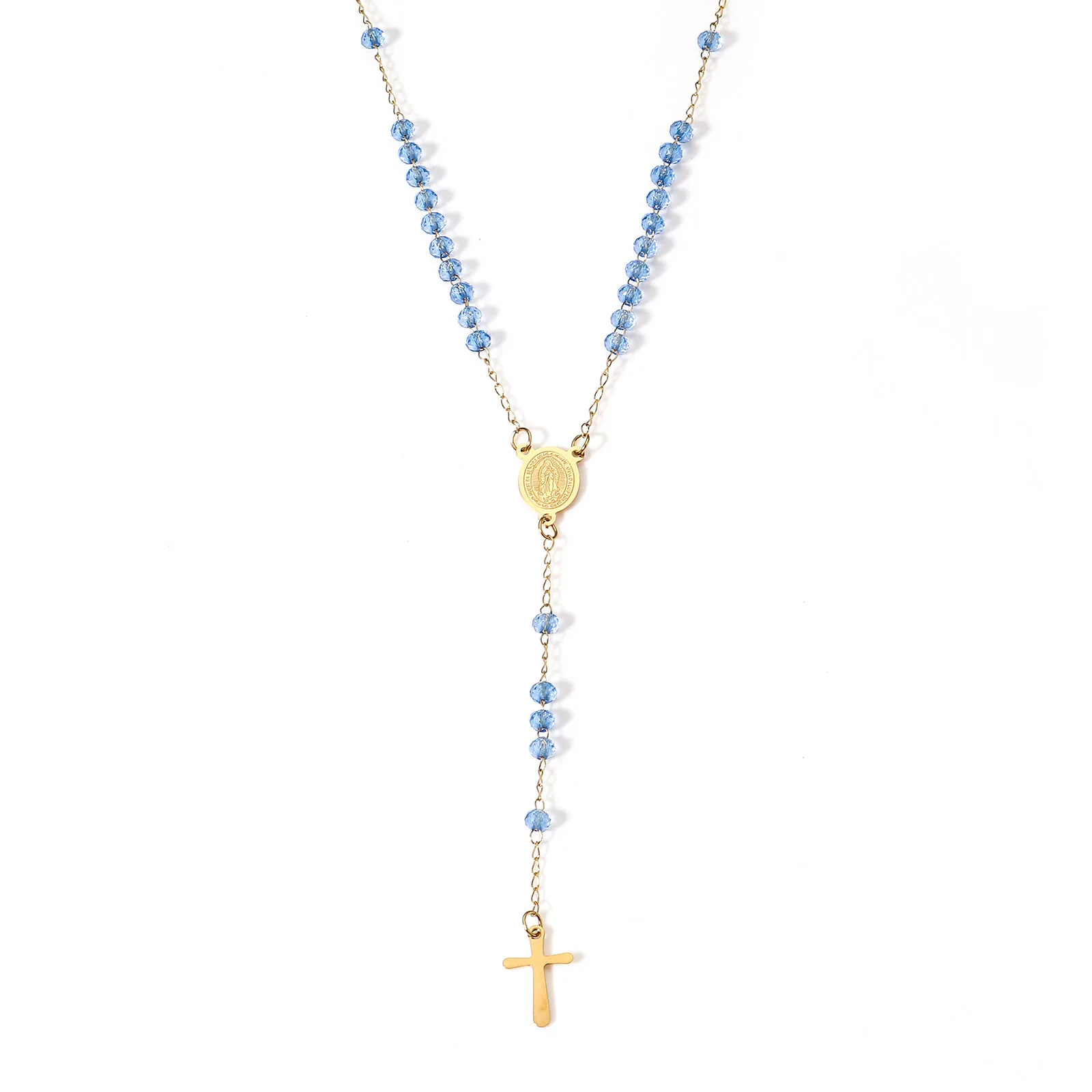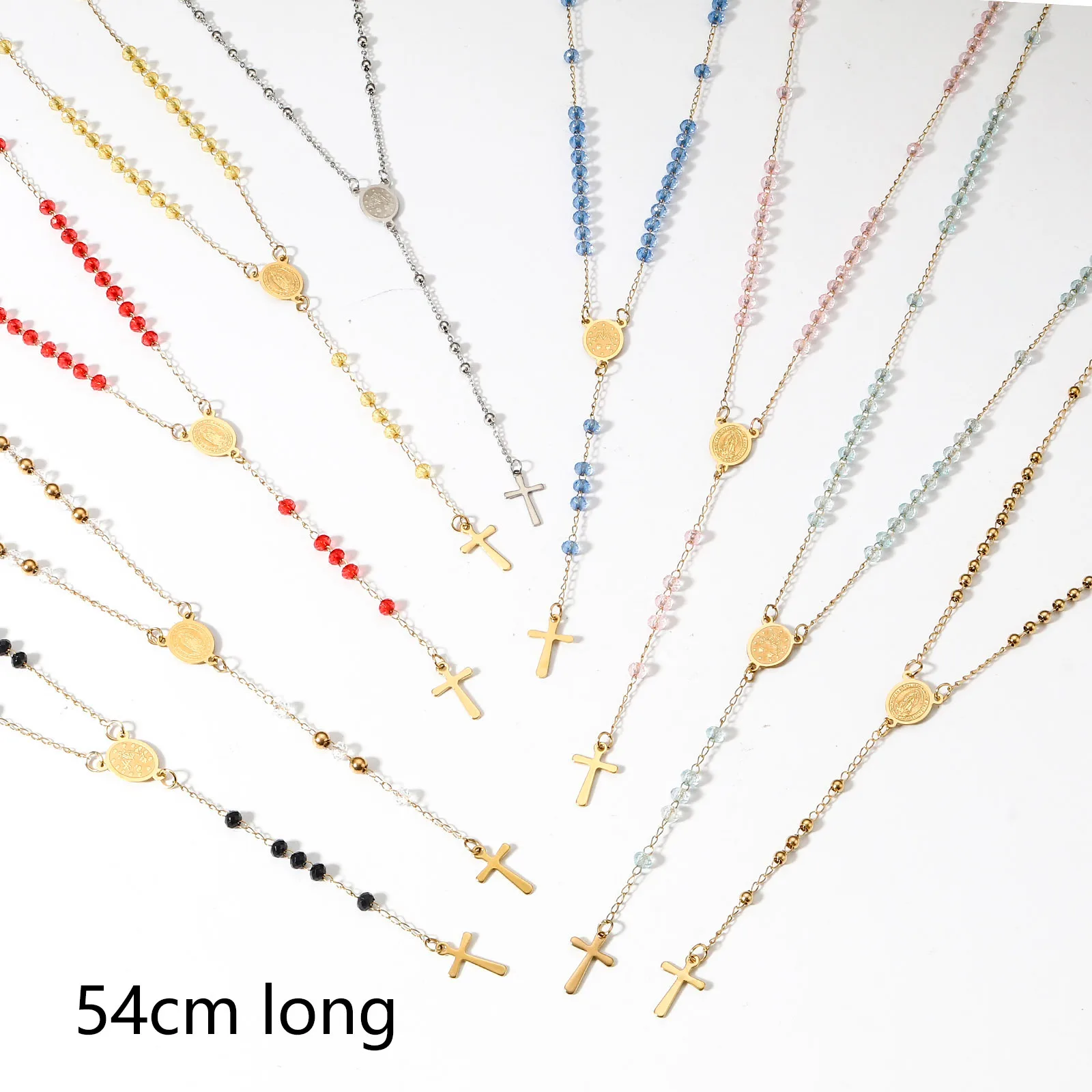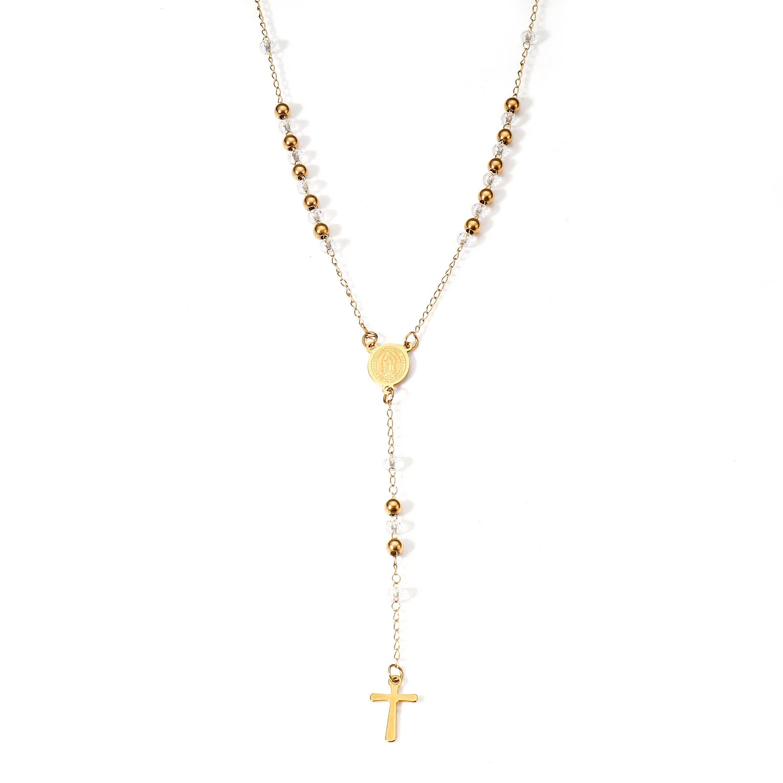 1 Piece 304 Stainless Steel & Glass Religious Handmade Link Chain Necklace Gold Color Cross Virgin Mary Charm 54cm(21 2/8") long