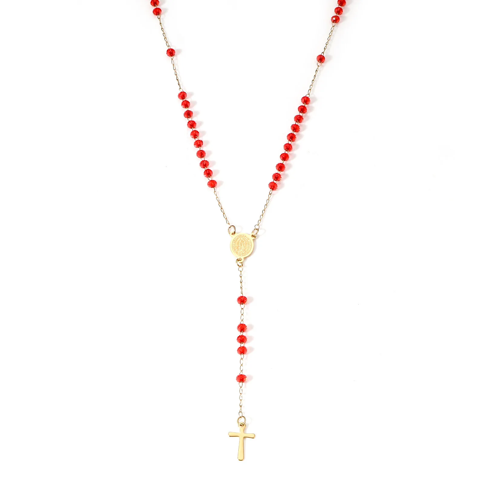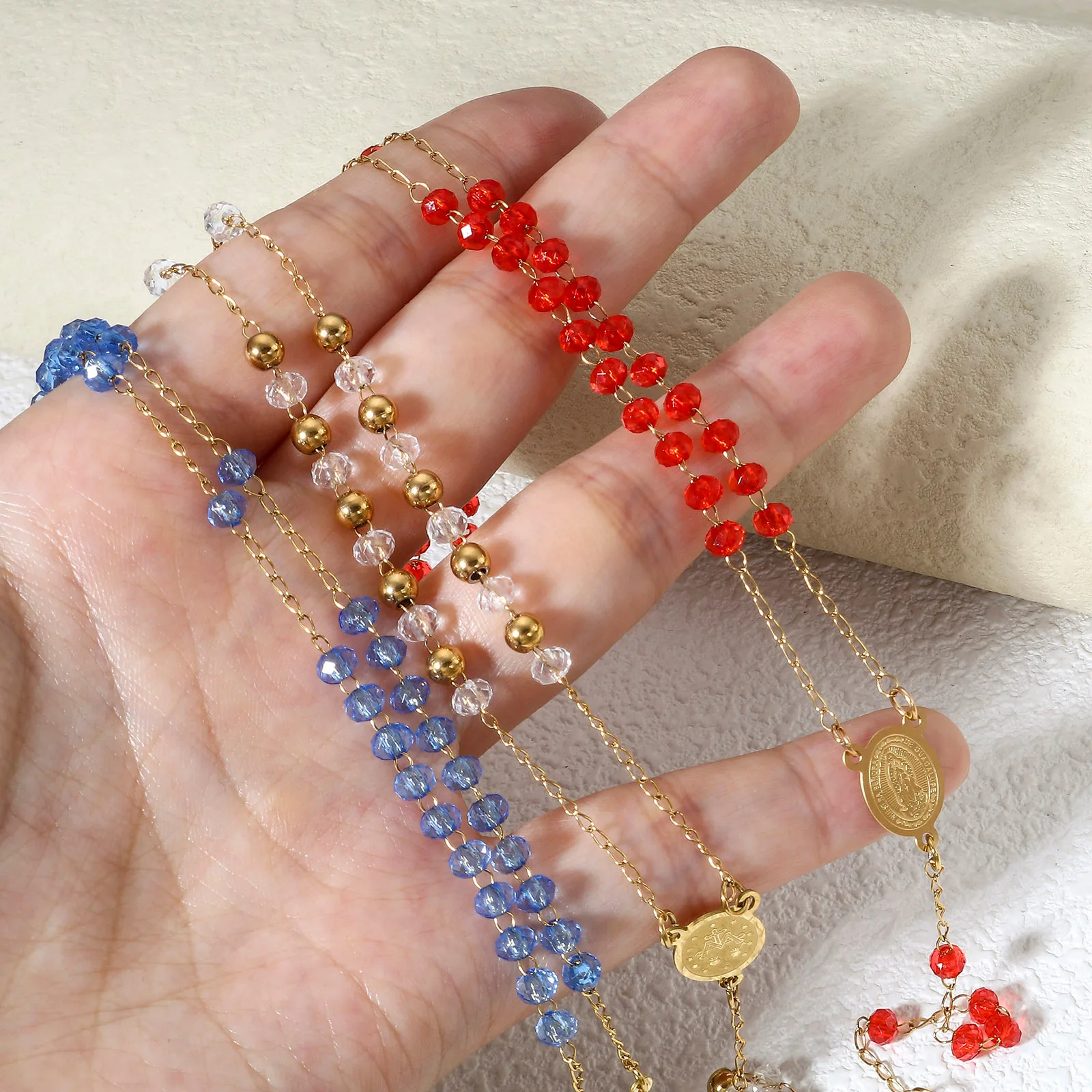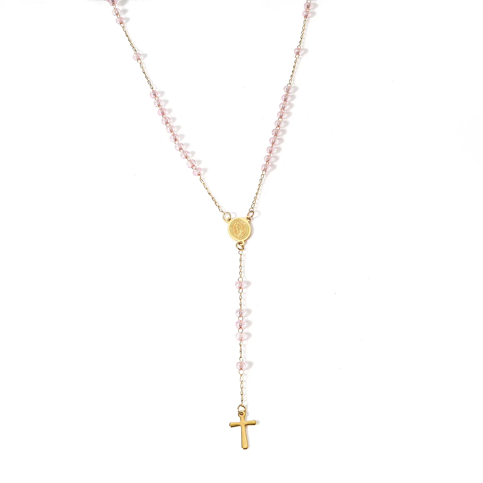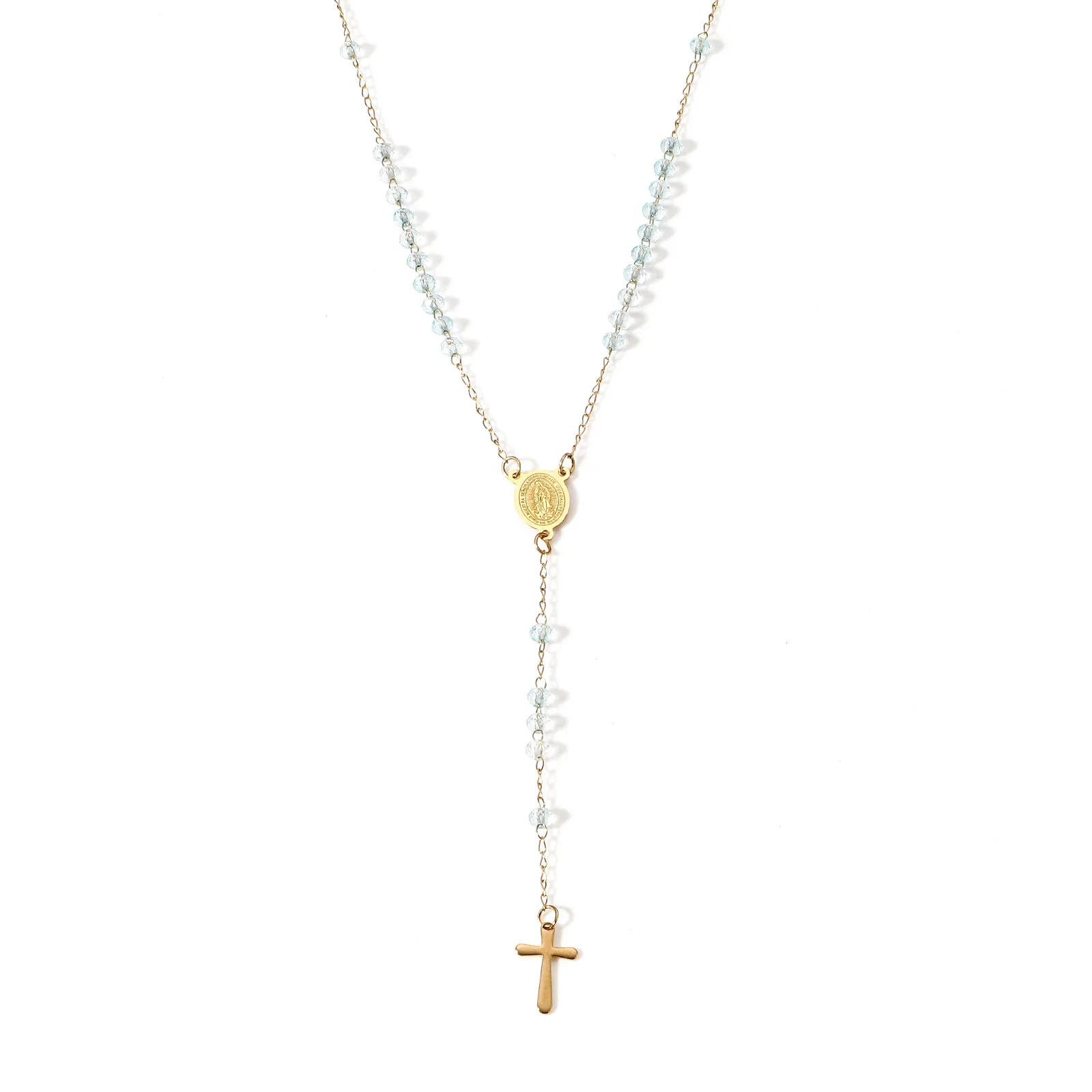 1 Piece 304 Stainless Steel & Glass Religious Handmade Link Chain Necklace Gold Color Cross Virgin Mary Charm 54cm(21 2/8") long