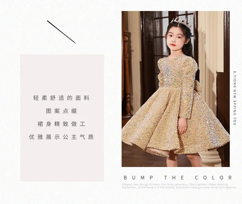 3-14 Yrs Flower Girls Dress Wedding Birthday Dress Golden Sequin Lace First Communion Dresses for Girls Baptism Party Vestidos