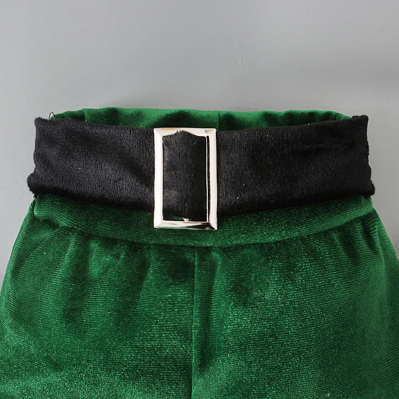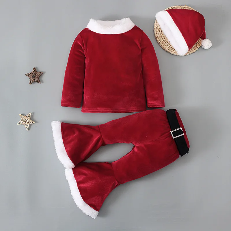 Baby Girls Christmas Cosplay Santa Claus Long Sleeve Red Bell Bottom Velvet Suit Carnival Party Kid Costume Top+Pant+Cap Clothes