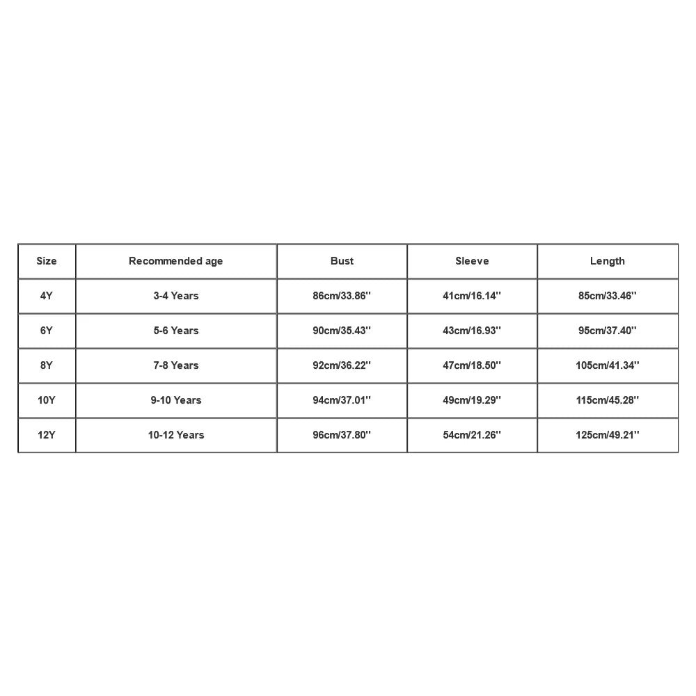 | Size:12Y | Recommended age:10-12 Years | Bust:96cm/37.80'' | Sleeve:54cm/21.26'' | Length:125cm/49.21'' |