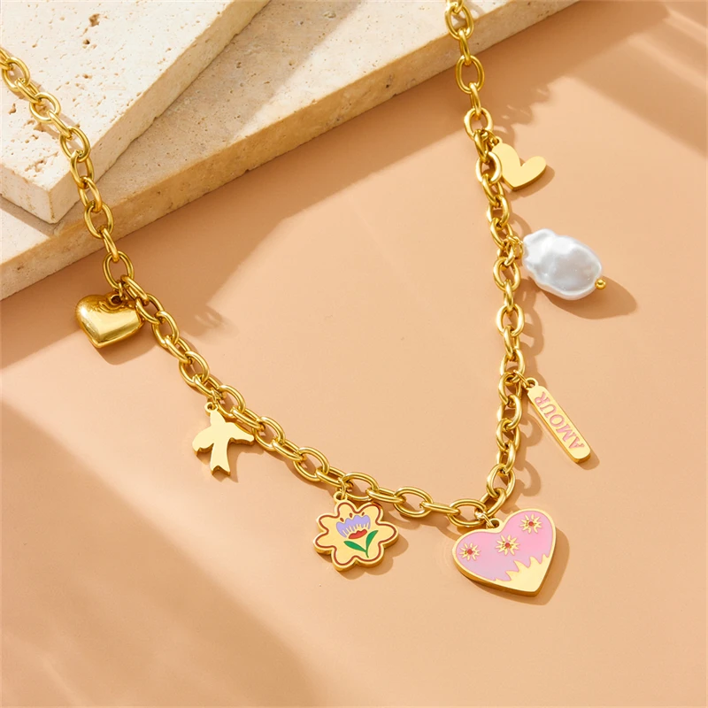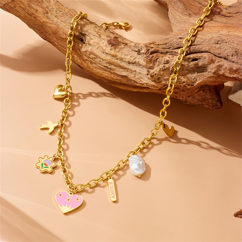DIEYURO 316L Stainless Steel Pink Heart Flower Irregular Pearl Pendant Necklace For Women New Trend Love Neck Jewelry Gift Party