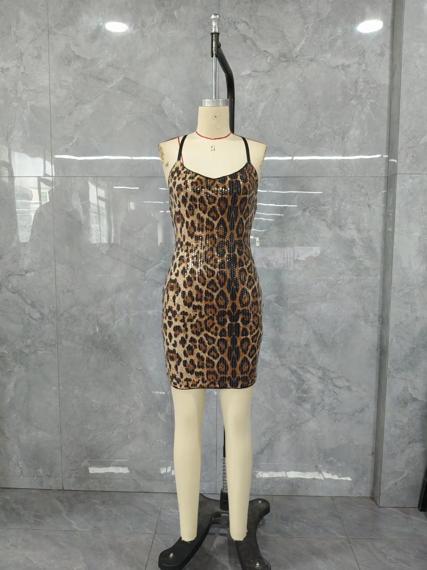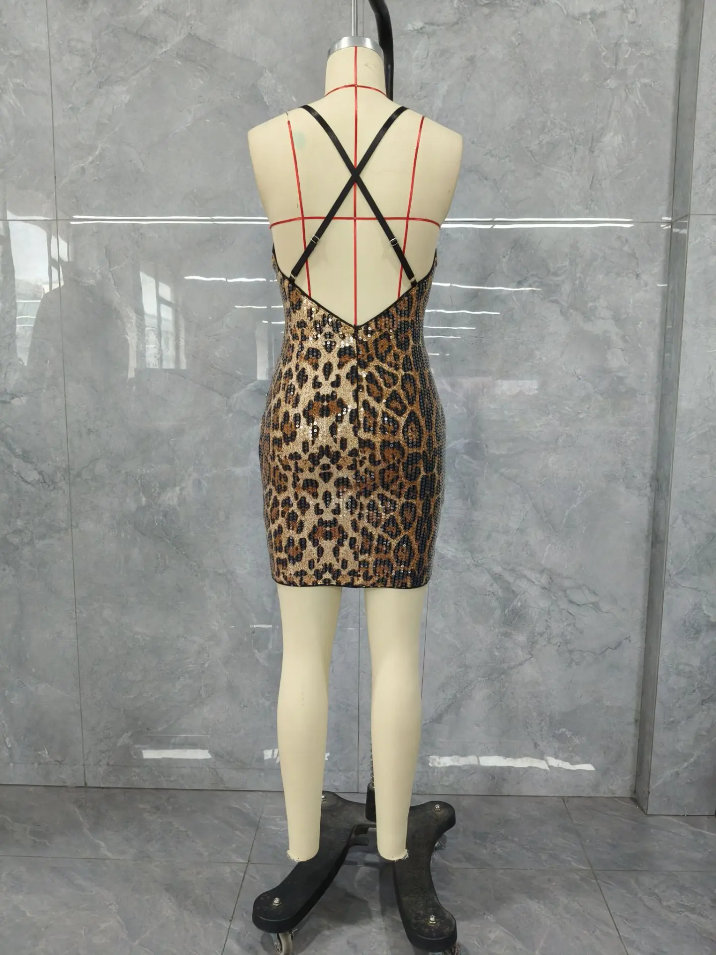 Leopard Pattern V-Neck Crisscross Backless Sequin Dress