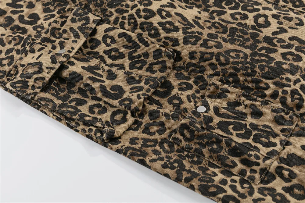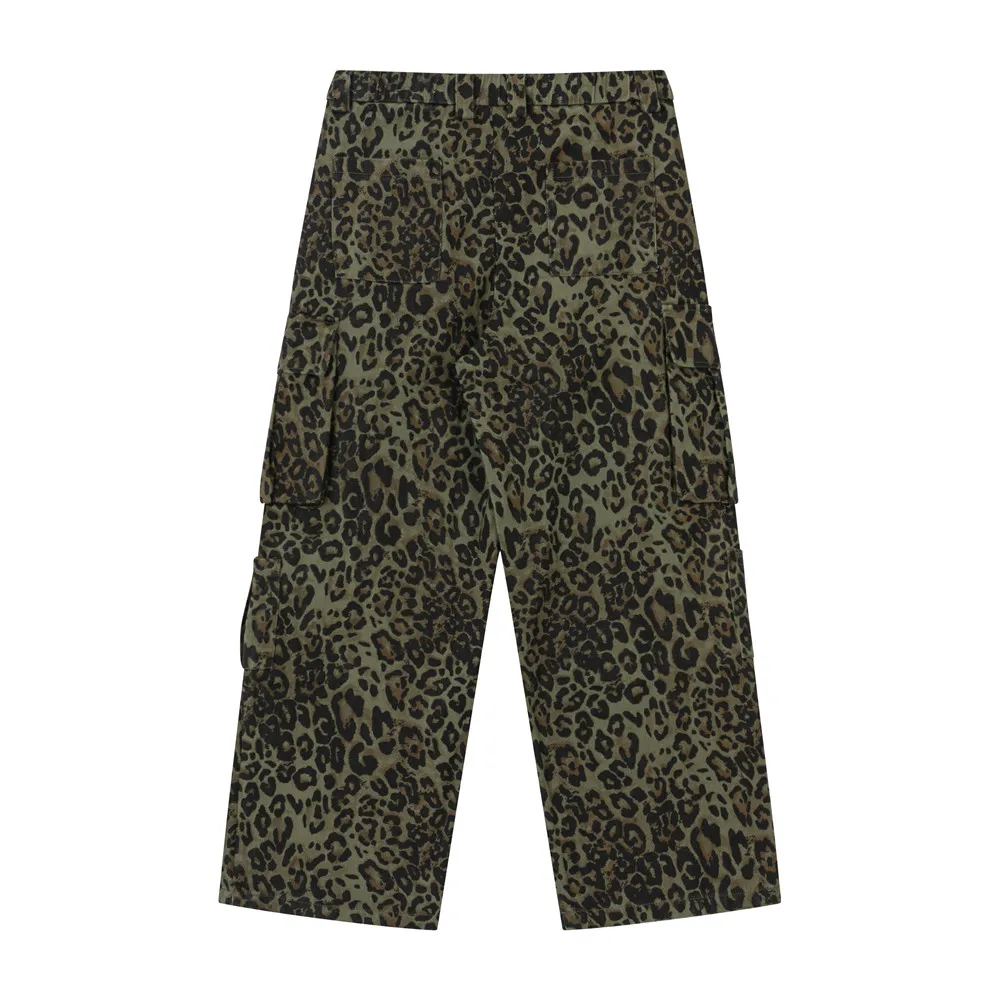 Leopard Print Cargo Pants Mens Multi-Pocket Retro Streetwear Straight Loose Wide Leg Trousers Men