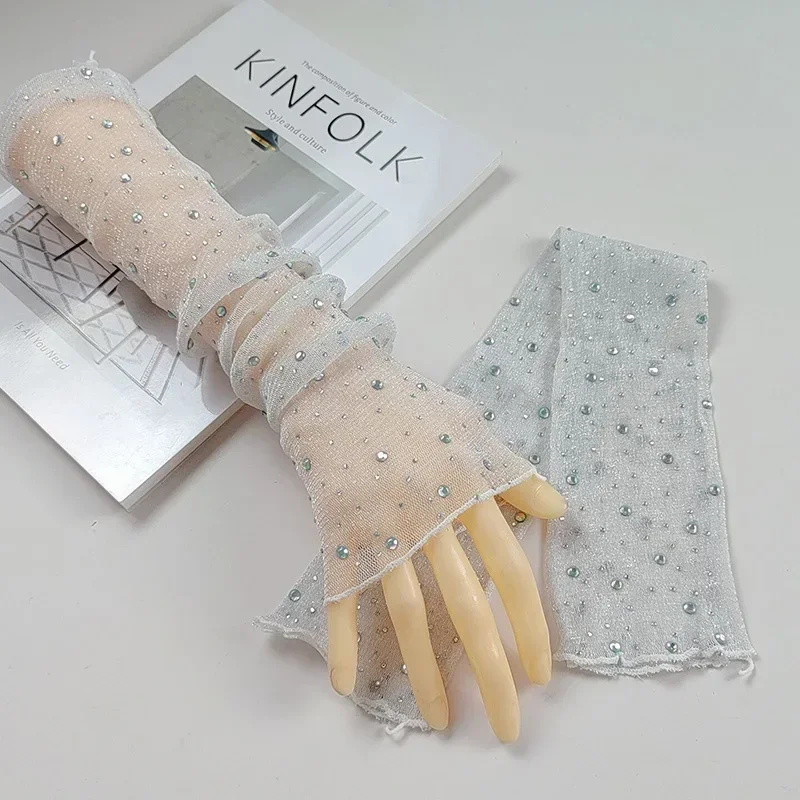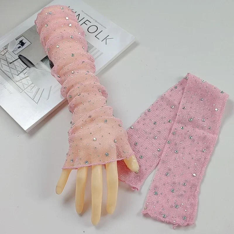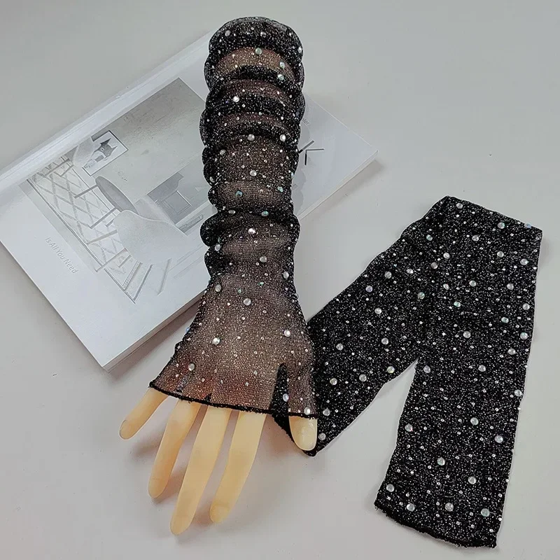 Sexy Wedding Bride Party Dress Dance Hot Drill Fingerless Sun Fishing Net Sleeve Glove Women Mesh Lace Rhinestone Mitten