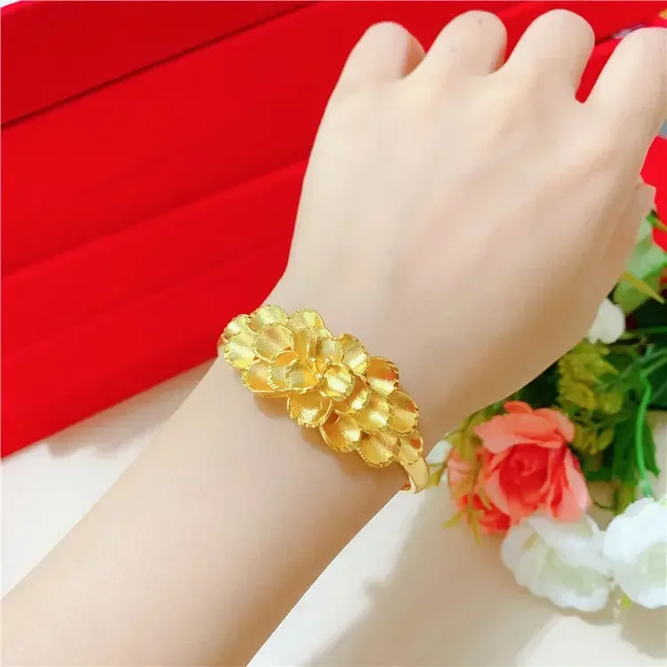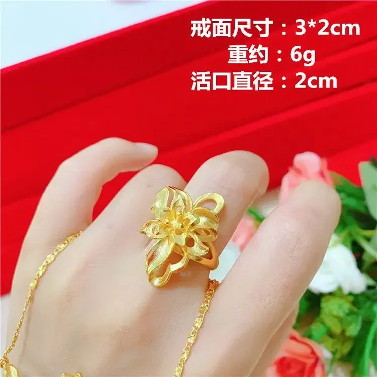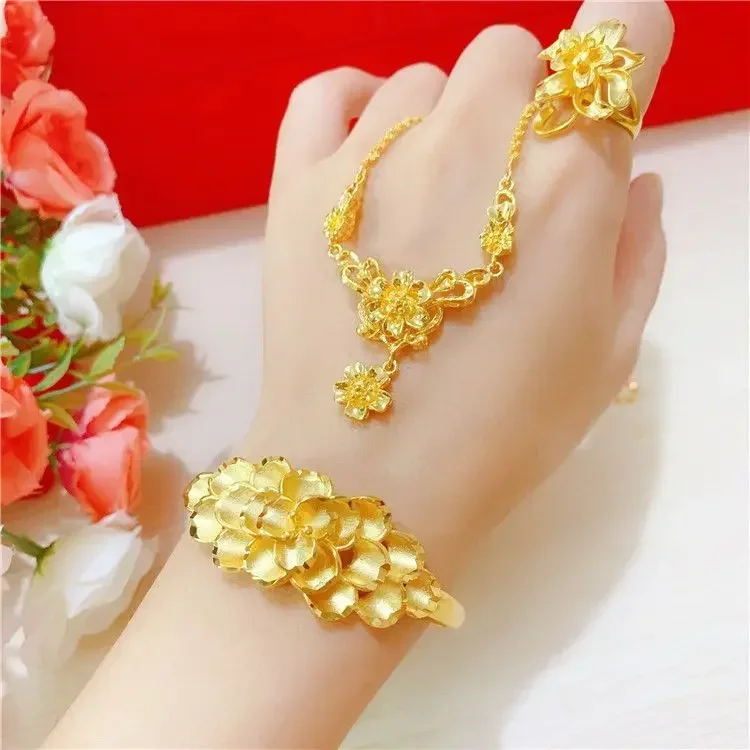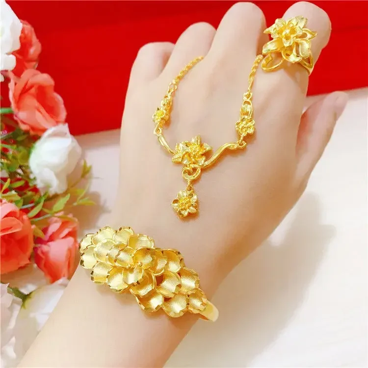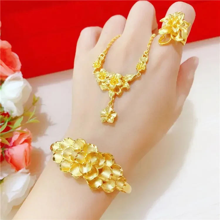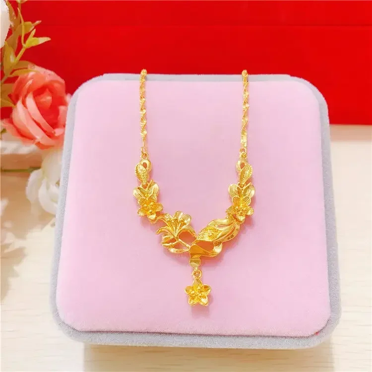 Simulation 100% Real 24K Gold Plated Women's Necklace Sandy Gold Necklace Flower Pendant Set Mother Grandma Gift Flower Earrings