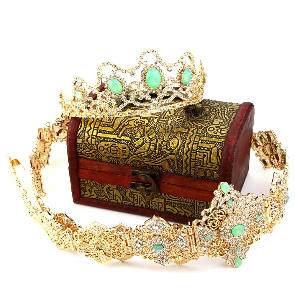 Sunspicems Mint-Green Crystal Algeria Women Belt Crown Sets Gold Color Arabic Wedding Jewelry Morocco Caftan Belt Chain Tiaras
