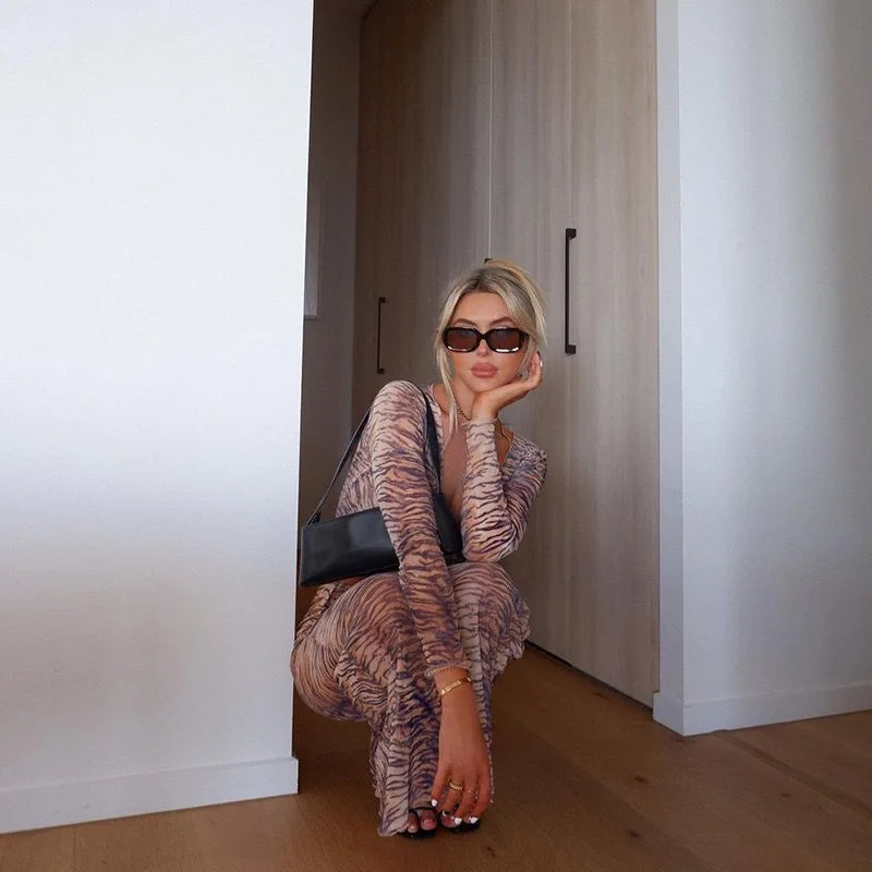 Tiger Printed Two Piece Set for Women, Sexy Long Sleeve Tops, Maxi Skirts, Matching Sets, Slim Outfits, Party Wear, Summer